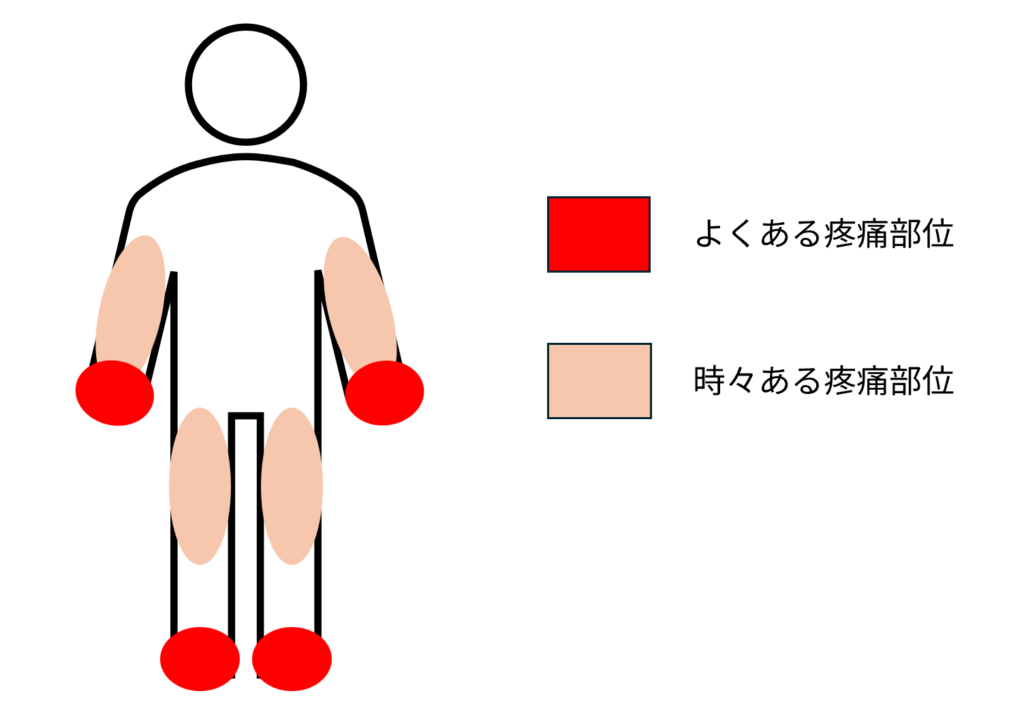 - 四肢末端の指先を中心(指先,手掌,つま先,足底)に,時に肘や膝当たりまで